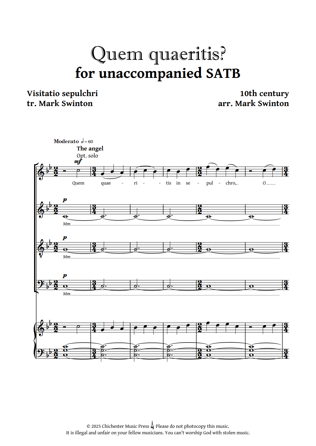 This setting harmonises the original plainchant while capturing something of the drama by casting a high voice as the angel while the lower voices of the choir represent the women at the tomb. The angel's gentle opening question ("Whom do you seek?") hovers over a static choral cloud, answered with poignant harmonies by the women as they name Jesus, the crucified. A triumphantly high retort from the angel ("Non est hic") leads to a more joyful affirmation from the women, as they exhort all people to praise God ("Alleluia") through flowing triadic harmonies. A solemn unison declaration of thanks to God and a more florid declaration of praise usher in a richly-textured reverent homophony, inviting the faithful to view the empty tomb and reflect anew on the miracle of Christ's resurrection.