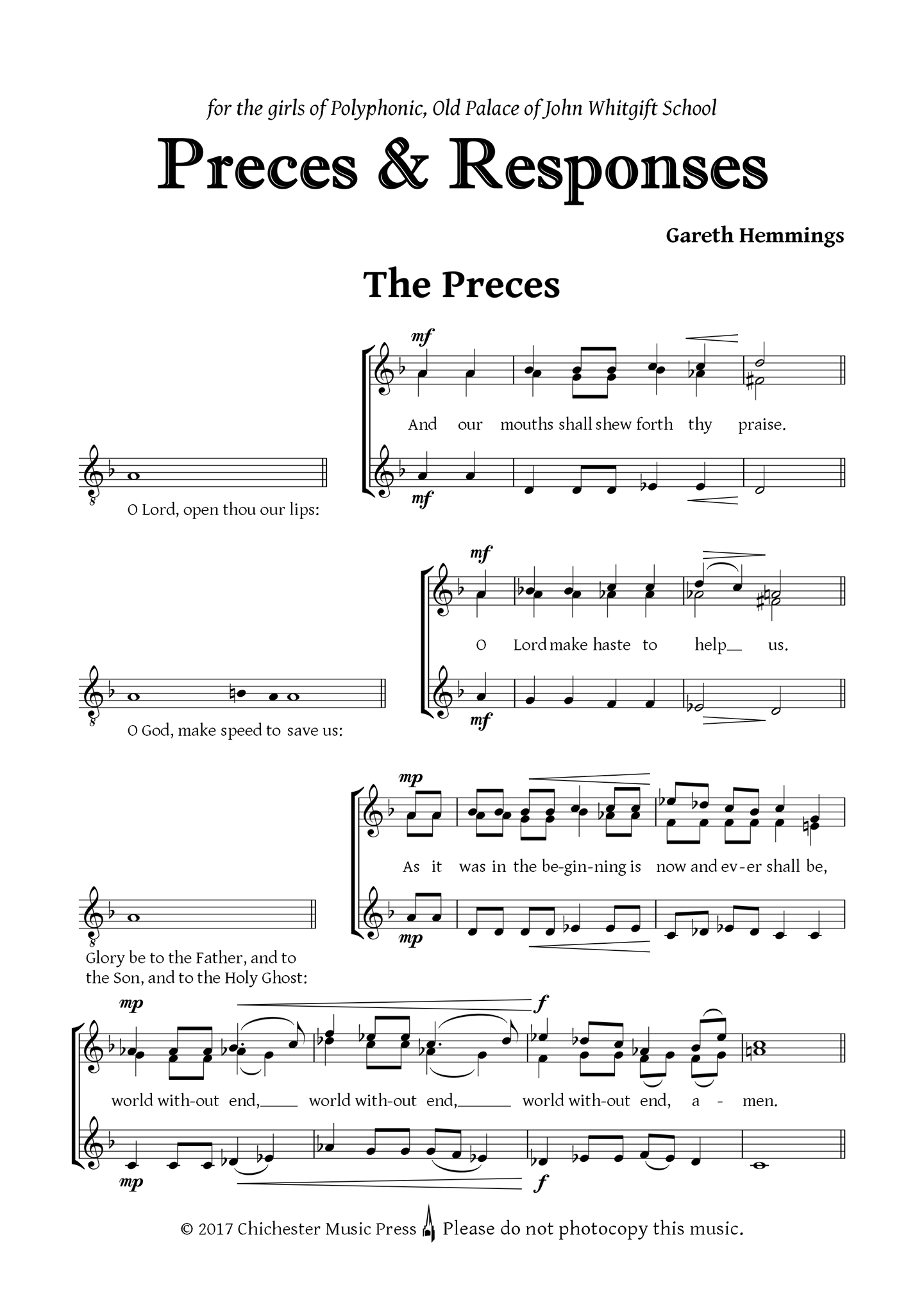 Written for the girls of Polyphonic, the Chapel Choir of Old Palace of John Whitgift School, these responses scored for unaccompanied SSA choir are melodic, exploiting expressive dissonance between the upper voice parts. These responses are a popular part of the choir's repertoire and have been performed in Croydon Minster, Worcester Cathedral, St Edmundsbury Cathedral, Southwark Cathedral and Winchester Cathedral.
