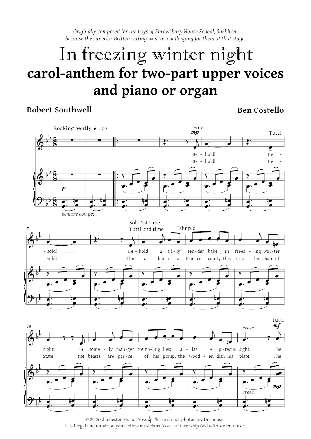 This much-loved poem by the Elizabethan Jesuit priest and poet Robert Southwell lends itself remarkably well to musical settings. With its symbolism and imagery, and effective use of metaphor, it transports us vividly to the Nativity. In this setting I have tried to capture something of the gentle rocking motion of the crib, whilst attempting to allow a portrayal of the awe, wonderment, mystique, and importantly the humility of this regal birth to emerge along the way.