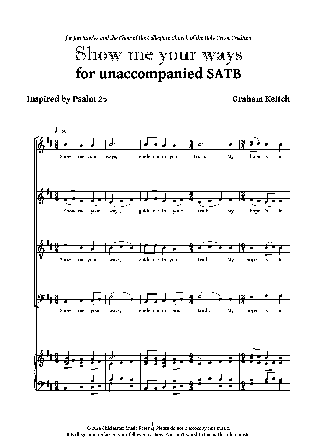 The text for this short motet was inspired by some of the words contained in Psalm 25 vv4-7. 'Show me your ways, guide me in your truth. My hope is in you'. The motet can be sung as an introit for evensong or during Holy Communion at any time throughout most of the liturgical year.